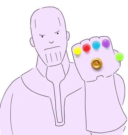 Cartoon Thanos with an Infinity Gauntlet made of candy, takes a chocolate from it and eats it.