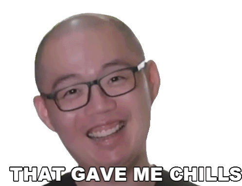 Chris Cantada smiles and nods, saying "That Gave Me Chills." Expresses excitement or a thrilling feeling.