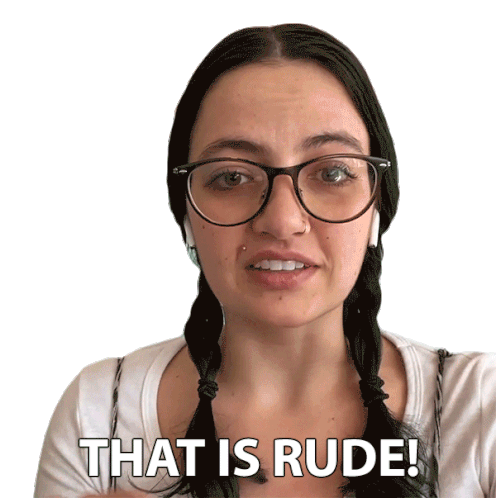 A woman points and says 'That Is Rude!' with a stern expression, emphasizing her disapproval.