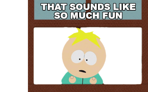 Butters Stotch from South Park expresses sarcastic enthusiasm with "That sounds like so much fun" while looking anxious.