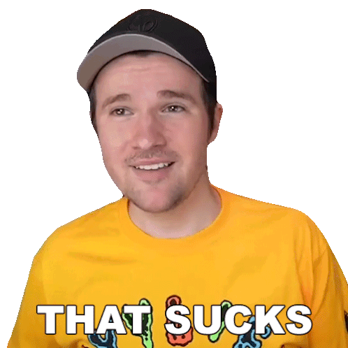 Elvis The Alien, wearing a cap and yellow shirt, expresses disappointment with the phrase 'That Sucks'.