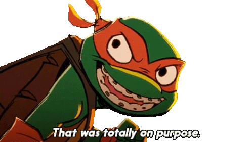 Michelangelo from TMNT confidently declares 'That was totally on purpose' after an unseen event, showcasing his playful and mischievous nature.