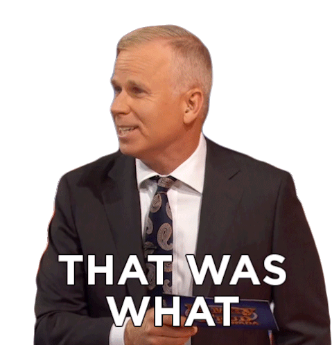Gerry Dee, host of Family Feud Canada, reacts with a classic 'That was what she said!' joke, looking surprised then smiling.