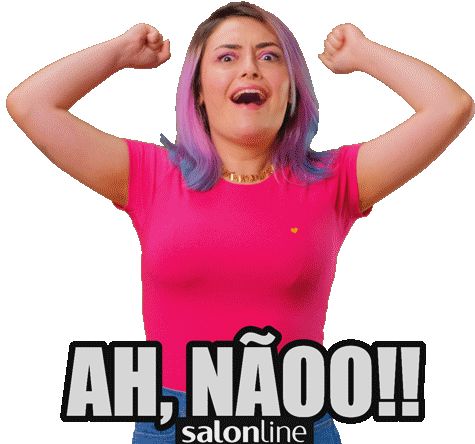 Thata Thais Cazelli expresses frustration, shouting "AH, NÃOO!!" with clenched fists and colorful hair.