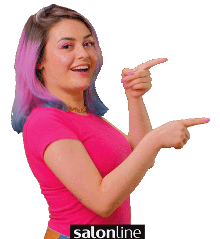 Thata Thais Cazelli, a smiling influencer with pink and blue hair, points to the side, promoting Salon Line.
