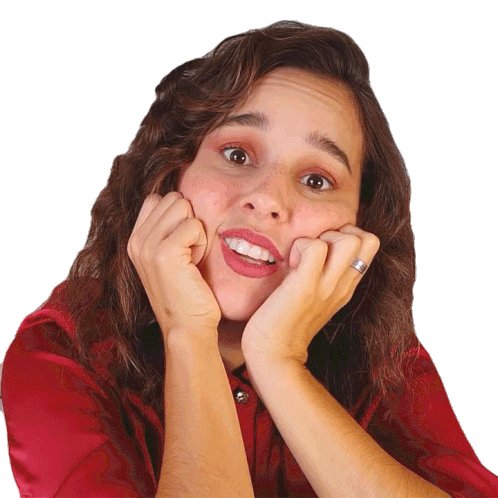 Thati Lopes from Porta Dos Fundos looks surprised and questioning, with her hands cupped around her face, asking 'É?'.