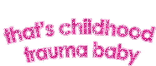 An animated sticker featuring the phrase 'That's Childhood Trauma Baby' in sparkling pink glitter on a white background.