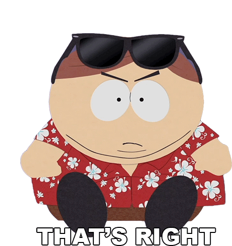 Eric Cartman from South Park, wearing sunglasses and a Hawaiian shirt, confidently declares "That's Right."