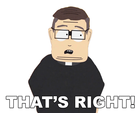 Father Maxi from South Park animatedly says 'THAT'S RIGHT!' with a confirming gesture.