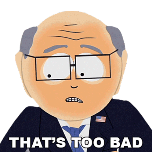 Mr. Garrison from South Park expresses disappointment, saying 'That's Too Bad' with a shrug and a slight smile.