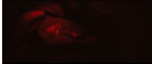 The iconic Batman chest symbol illuminated by a dramatic red light, showcasing the detailed suit in a dark setting.
