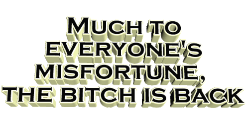 Animated 3D text declares 'MUCH TO EVERYONE'S MISFORTUNE, THE BITCH IS BACK' with a dramatic flair.