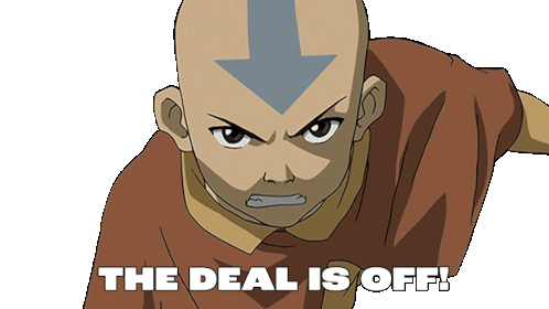 Aang from Avatar: The Last Airbender, with an angry expression, declares 'THE DEAL IS OFF!' in a powerful moment.