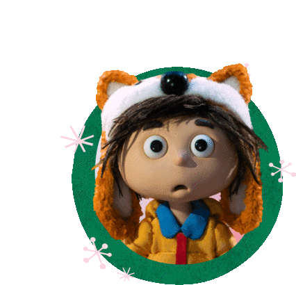 A cheerful character from Shaun The Sheep's 'The Flight Before Christmas' smiles, wearing a fox hat.