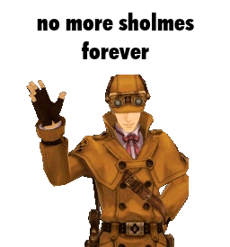 Herlock Sholmes from The Great Ace Attorney raises his hand with the text 'no more sholmes forever' in this animated sticker.