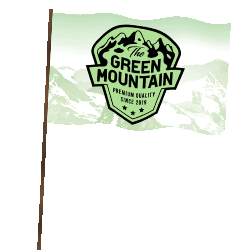 Animated sticker for The Green Mountain, a Swiss vegan brand, featuring its mountain-themed logo with 'Premium Quality Since 2019'.