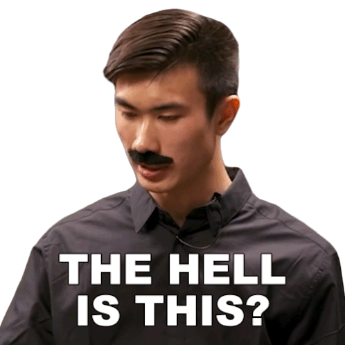 Nathan Doan, wearing a fake mustache, looks confused and asks 'The Hell Is This?' with a bewildered expression.