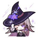 a girl wearing a witch hat with purple flowers on it .