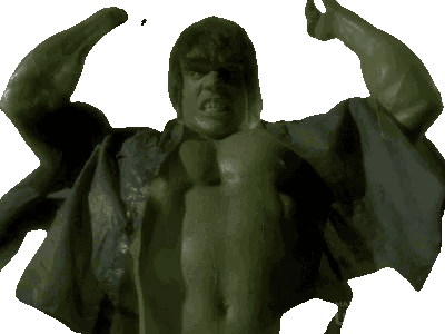 The Incredible Hulk, green-skinned and muscular, flexes his biceps with an angry expression, showcasing his immense strength.
