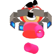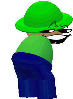 a cartoon character wearing a green hat and blue pants is making a funny face .