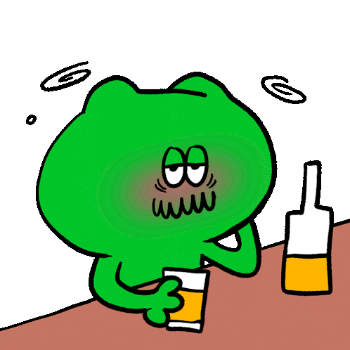 The Neighbours character, a green frog, looks dizzy and unwell while holding a beer, clearly suffering from a hangover.