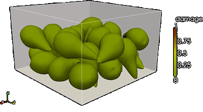 A 3D computer-generated visualization of green pear-like objects wiggling within a transparent box, showing increasing damage.