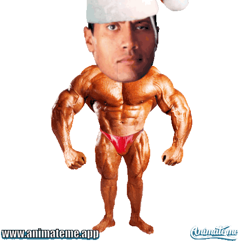 Dwayne 'The Rock' Johnson's head on a muscular bodybuilder wearing a Santa hat, a festive and funny Christmas meme.