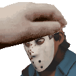 A person in a jumpsuit and hockey mask is touched by another, from The Scratched Universe Petpetpet.