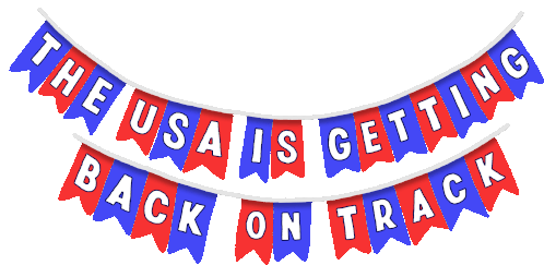 Patriotic bunting declares 'The USA Is Getting Back On Track', celebrating the efforts of President Joe Biden and Vice President Kamala Harris.