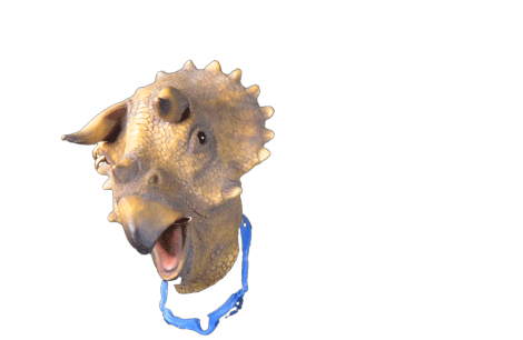 An animated sticker featuring Thedinosaursskin Triceratops mask, rotating to show its detailed design and blue strap.