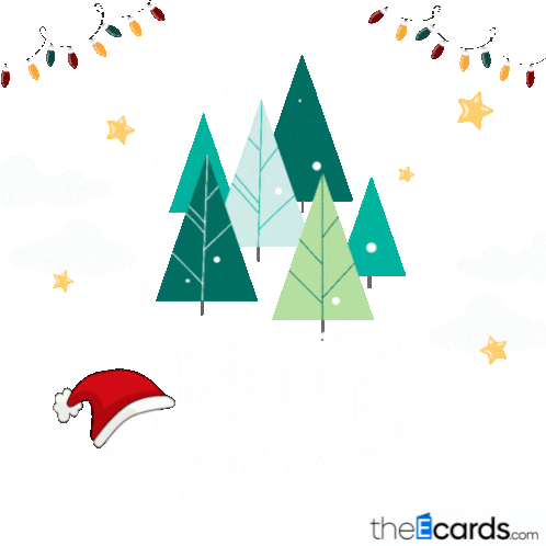 A festive animated sticker featuring a winter wonderland with stylized Christmas trees, falling snow, and a Santa hat.