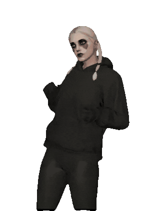 Thegeekentry Stacey Rp, a striking character with pale skin, dark makeup, and braided hair, poses in a black hoodie and pants.