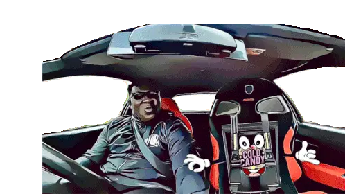 Thegifyguy (DMO) drives a car with the animated Coldcandy mascot in the passenger seat, both reacting.