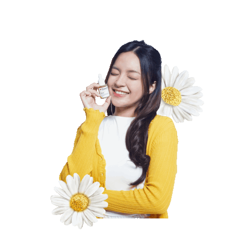 A happy woman in a yellow cardigan smiles while holding a Theraskin Ecaaura serum bottle, surrounded by skincare products and daisies.