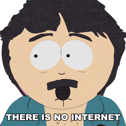 Randy Marsh from South Park reacts with shock and frustration to the absence of internet, exclaiming "THERE IS NO INTERNET".