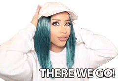 Amber Scholl in a cool blue wig, wearing a white cap, reacts with a sassy expression as the text 'THERE WE GO!' appears.
