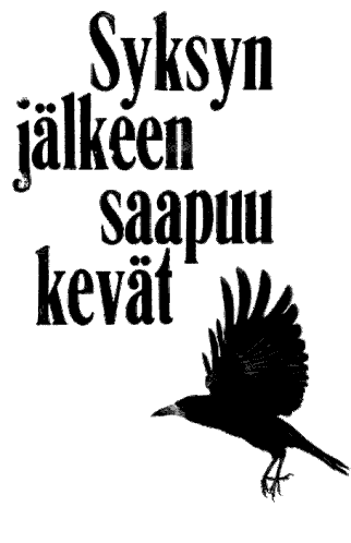 Black and white sticker with Finnish text 'Syksyn jälkeen saapuu kevät' (After autumn comes spring) and a crow, from 'There Will Be Spring' movie.