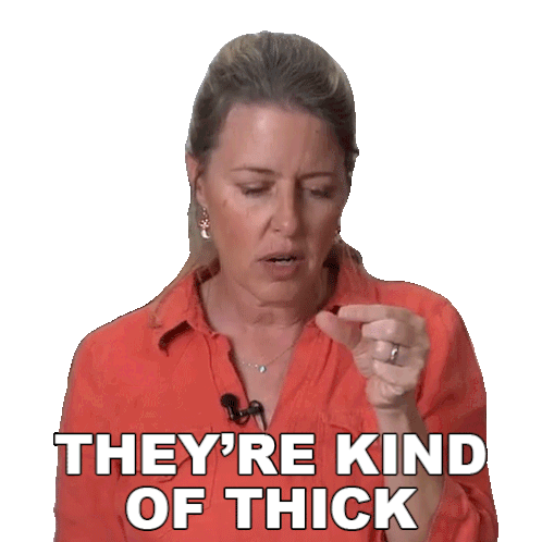 Jill Dalton gestures with her fingers while saying "They're Kind Of Thick," a phrase from her plant-based cooking show.