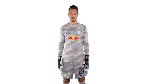 Janis Blaswich, the RB Leipzig goalkeeper, gestures 'think about it' by tapping his temple, encouraging thoughtful consideration.