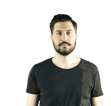 An animated sticker of a man with a beard, wearing a black t-shirt, striking a thoughtful pose, representing Dlubal Software.