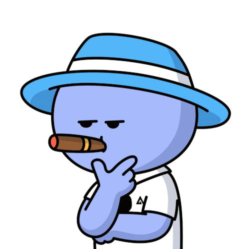 A cartoon character wearing a blue hat and smoking a cigar, deep in thought and pondering.