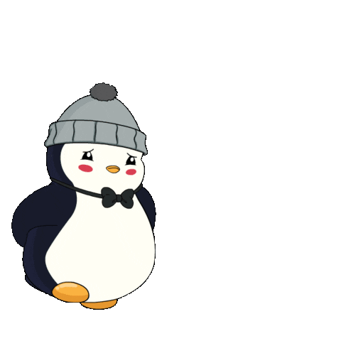 A cute pudgy penguin in a beanie hat ponders deeply, expressing curiosity and uncertainty with dots above its head.
