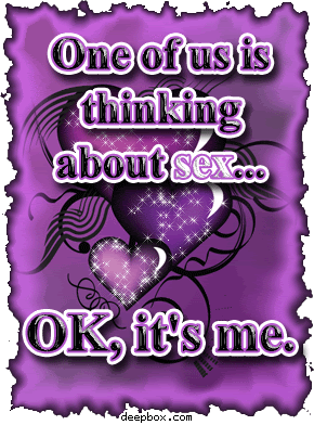 A purple graphic with sparkling hearts and text confessing "One of us is thinking about sex... OK, it's me."