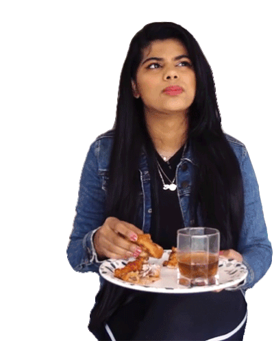 Shreya from Buzzfeed India chews food thoughtfully, making a discerning expression while holding a plate of chicken and a drink.