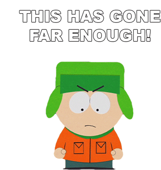 Kyle Broflovski from South Park, looking angry and saying "This Has Gone Far Enough!" expressing his frustration.