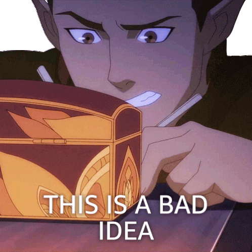 Vaxildan from The Legend of Vox Machina looking at a glowing chest with the caption 'THIS IS A BAD IDEA'.