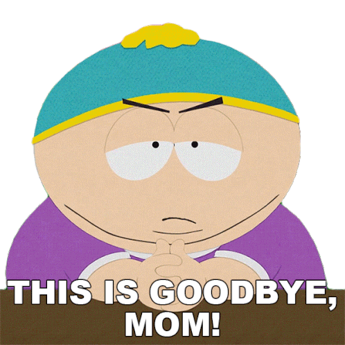 Cartman from South Park dramatically says "This Is Goodbye, Mom!" with an angry and determined expression.