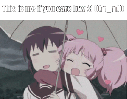 Two anime girls share a sweet hug under an umbrella, with the caption 'This is me if you care btw :3 O(n_n)O' displayed.