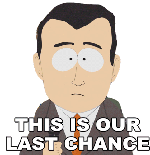 A concerned South Park character holds a microphone, delivering a serious message: "This Is Our Last Chance."