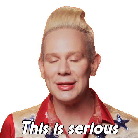Jimbo from RuPaul's Drag Race looks serious, emphasizing the gravity of a situation with the caption 'This is serious'.
